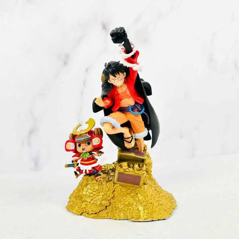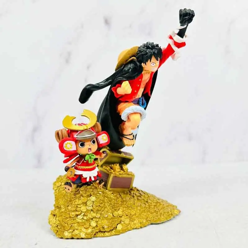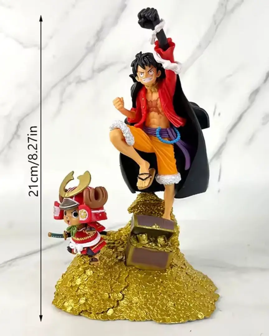 مجسّم فاخر مستوحى من أنمي One Piece، يجسّد لوفي و تشوبر فوق جبل صغير من الذهب بجانب صندوق كنوز ممتلئ.