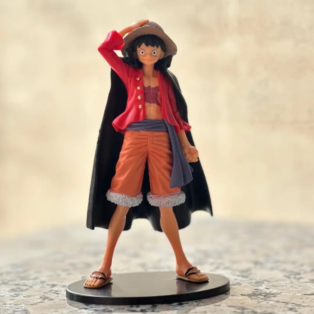 مجسّم مميز للبطل مونكي دي. لوفي، يظهر فيه مرتدياً رداءً أسود ينسدل على ظهره، بينما يضع يده على قبعة القش في وضعية أيقونية مليئة بالكاريزما.